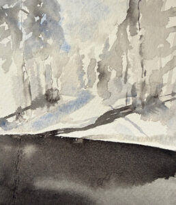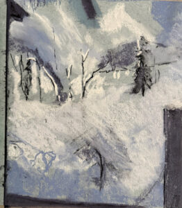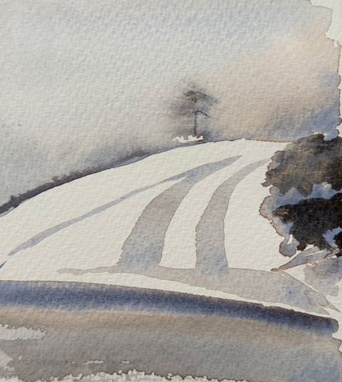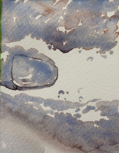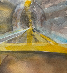 I replay ‘frames’ from that heart-in-mouth, sublime journey, trying to capturing in watercolour and pastel sketches its strange mood and feeling.