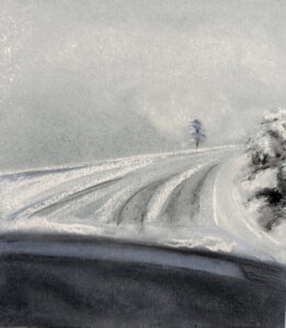 Then the first flakes begin to fall; fast-settling on the white car – muffling and enclosing, wipers struggle against the weight of snow. Soon the only colours the red tail lights and yellow warning signs. We lose signal.